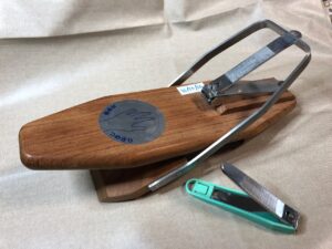 右半身が不自由なので、右手を使って左手の爪を切るのは困難です。では左手の爪をどうやって切るか。リハビリ病院を退院し、自宅に戻って最初にネット検索で見つけたのがこれです。左手を台の上に乗せ、手のひらで押し下げると、テコの原理で台に固定された爪切りの歯の部分がパチンと閉じる。シンプルな作りですが、使用者の願いを汲み取った絶妙な設計と思います。設計者の方には今でも、毎回使うたびに感謝しています。
